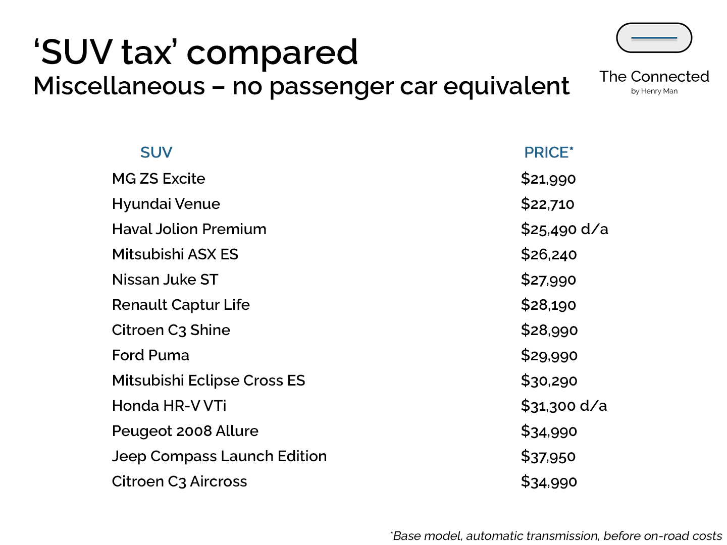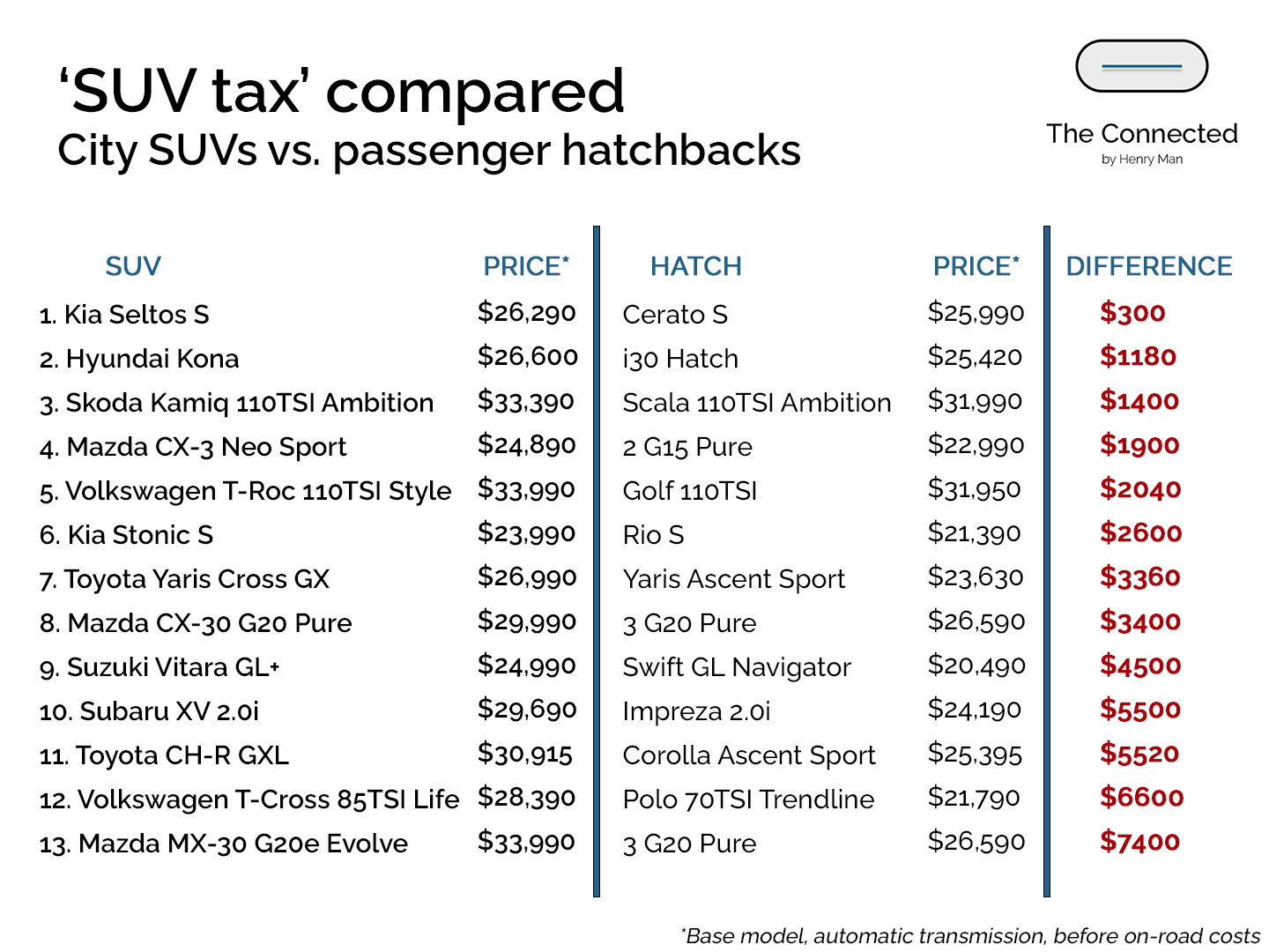 Light and small SUVs are booming. While they’re often based on hatchback passenger car architectures, SUVs are always more expensive than their derivatives. So, which city-sized models have the least ‘SUV tax’ charge?