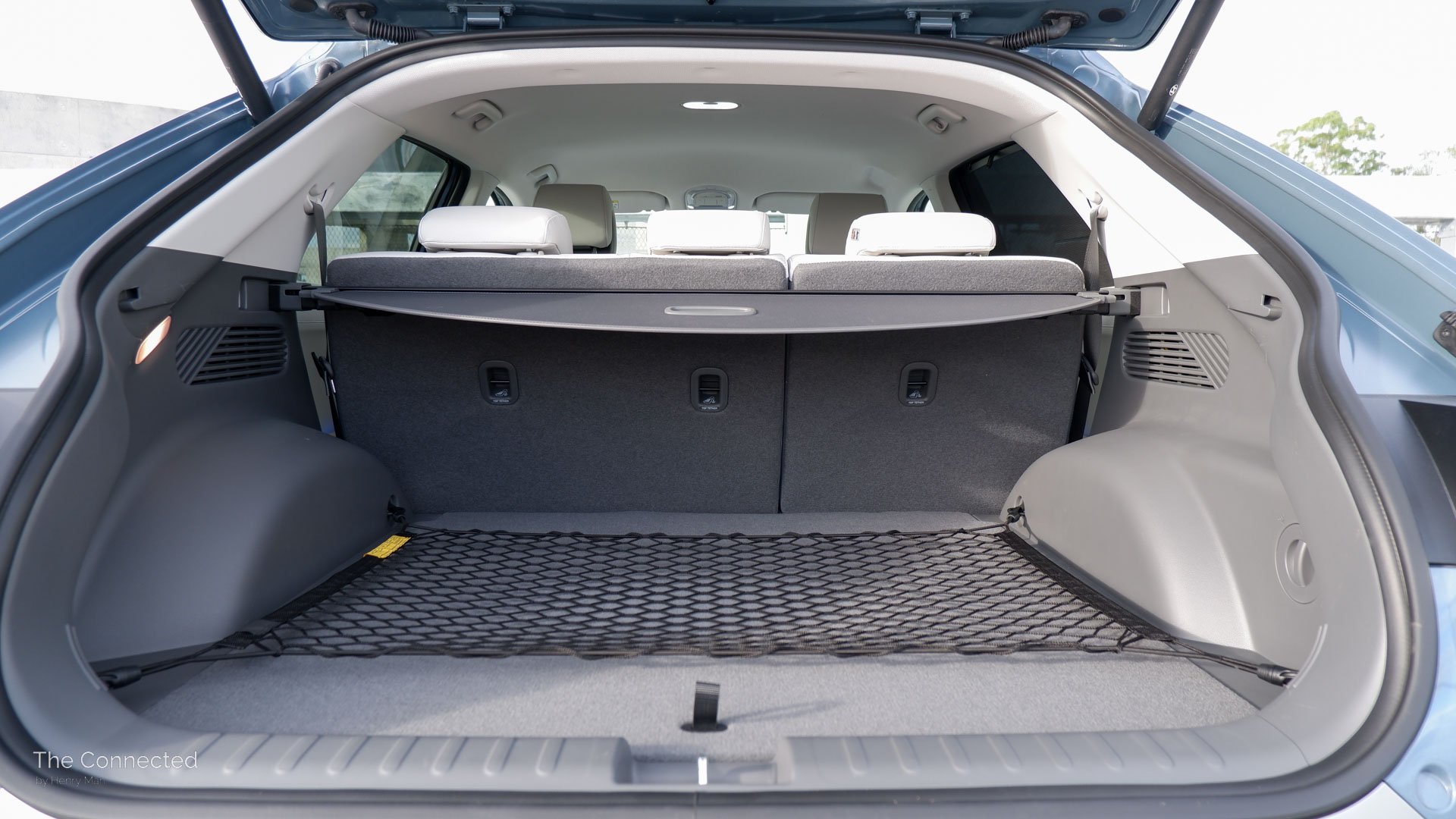 The sliding boot cover is set a bit lower and any bag hooks, but there is a luggage net included. Strangely, the area is illuminated by an incandescent bulb, which is at odds with the bright LED interior lighting and modern EV design.