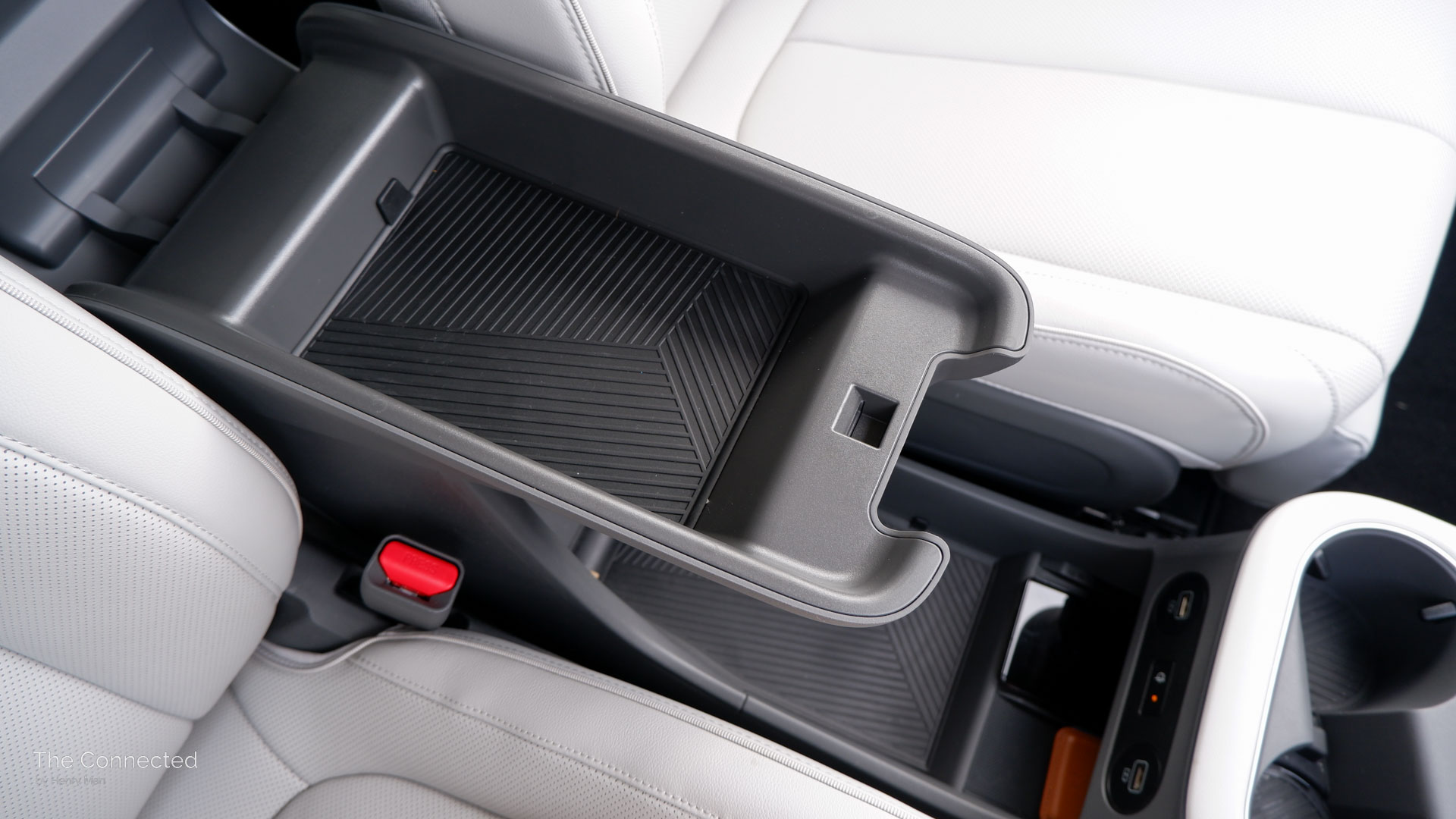 It’s home to an open tray large enough to store takeaway, a handbag or even a small backpack, with a Qi wireless phone charging pad, adjacent storage area, two USB-A charging ports, and easy-to-reach two cup holders. Above is the foldable armrest with a smaller lidded storage compartment, while the practical nine-litre glove drawer uniquely slides out (instead of popping down).