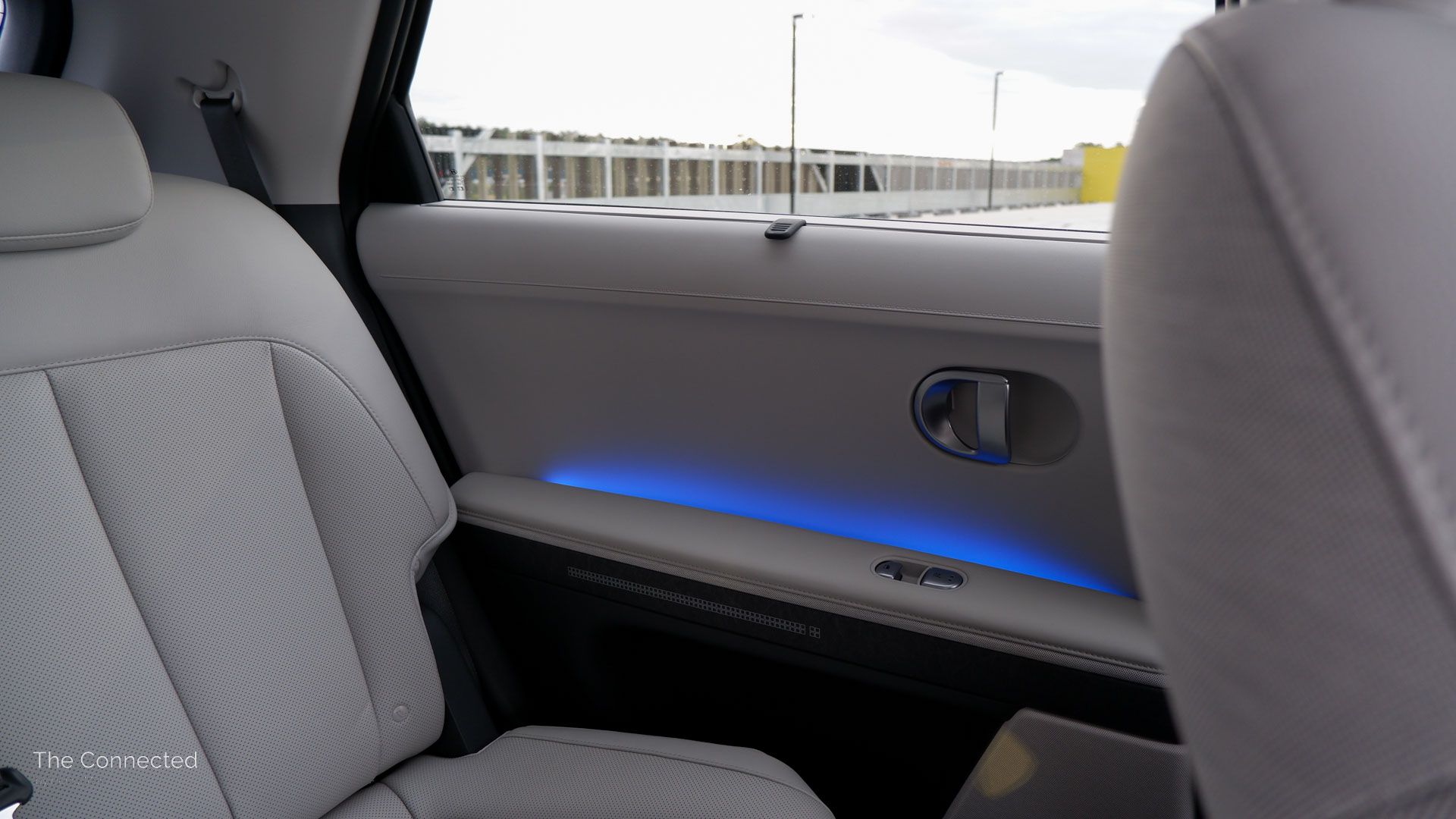 Sitting three abreast is doable thanks to the flat floor and wider body than the comparable Tucson. Other family-friendly Ioniq 5 features include the two ISOFIX child seat anchorage points on the outer seats, three top tethers, higher B-pillar mounted air vents, powered rear door and window child locks, and built-in manually retracting rear window sunshades standard from the Techniq.