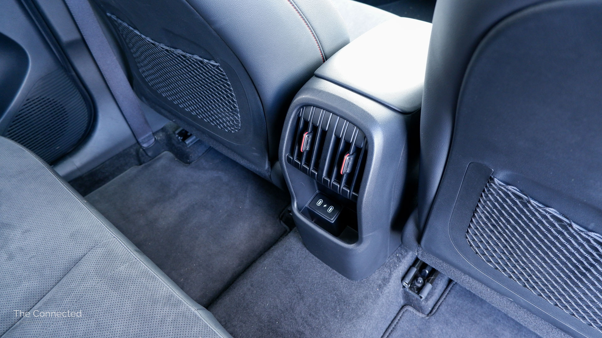 A fold-down armrest with two cup holders, rear air vents and two USB-C charging ports, alingside a small centre bin, seatback pockets, and tight door bottle holders are available for rear passengers.
