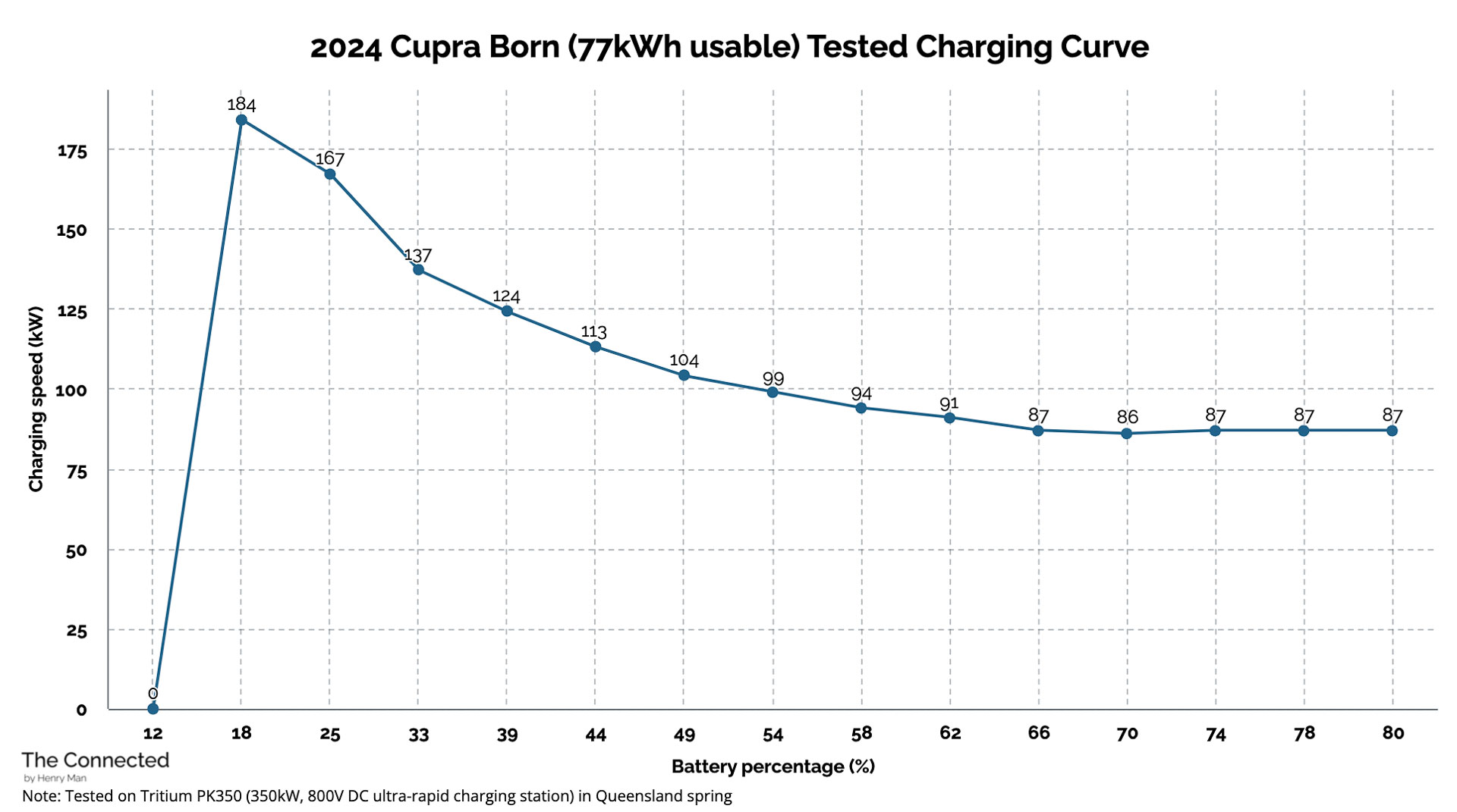 The electric car initially peaked at 184kW – faster than Cupra’s 170kW DC maximum claim – but quickly throttled down to 113kW at the 10-minute mark.