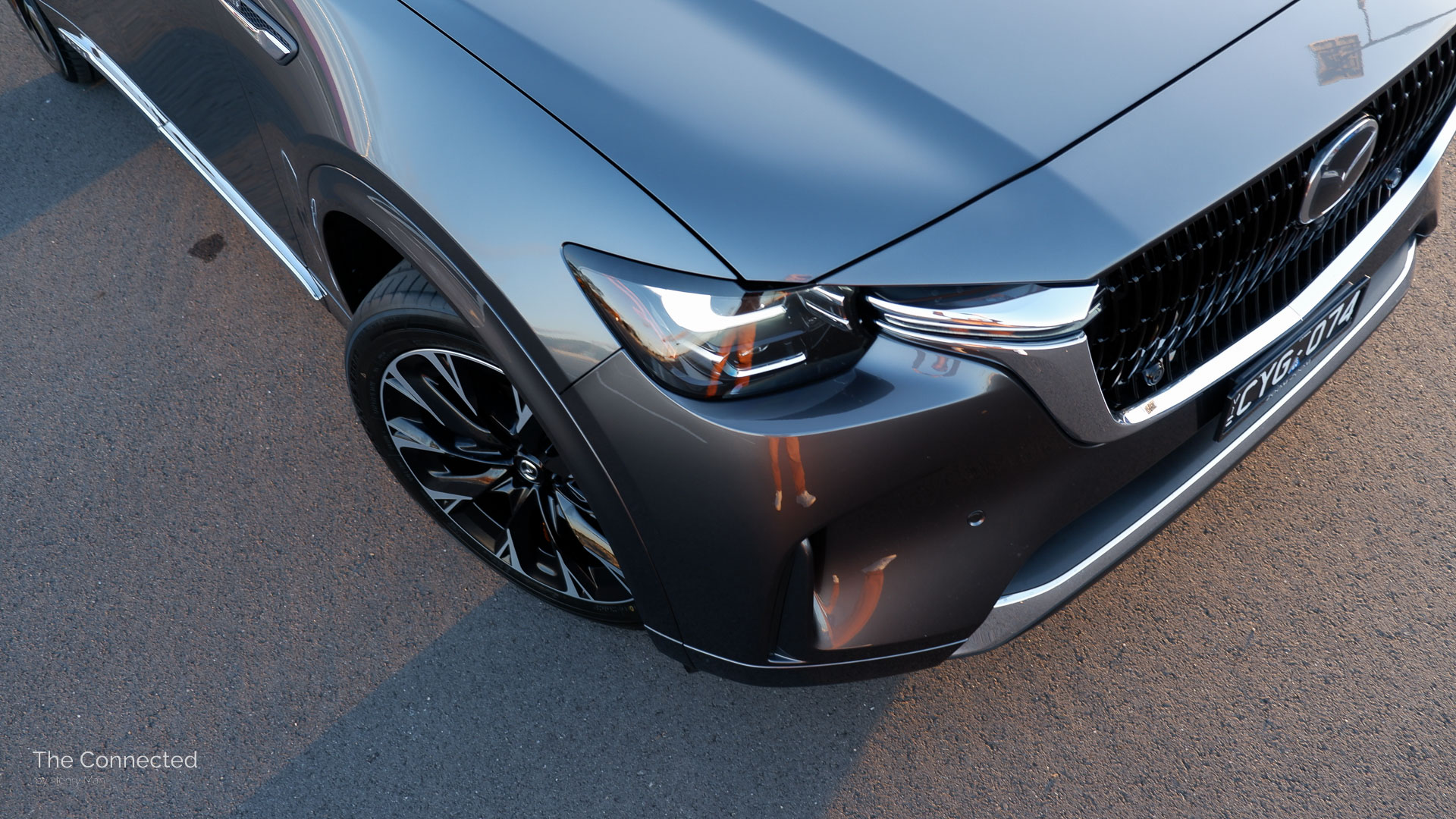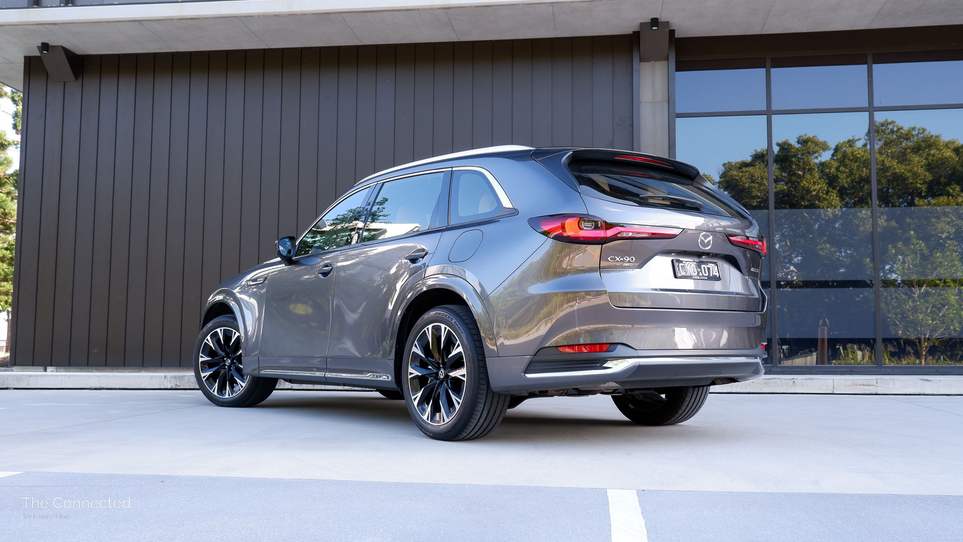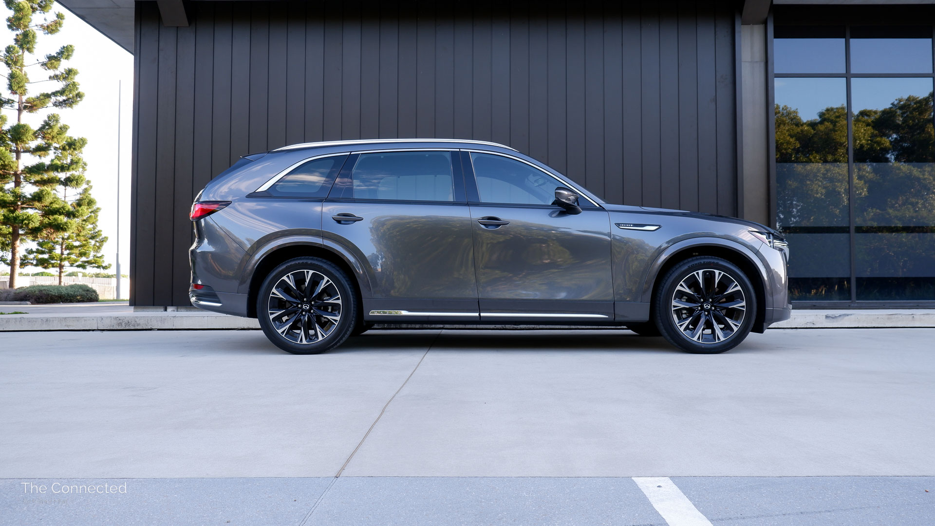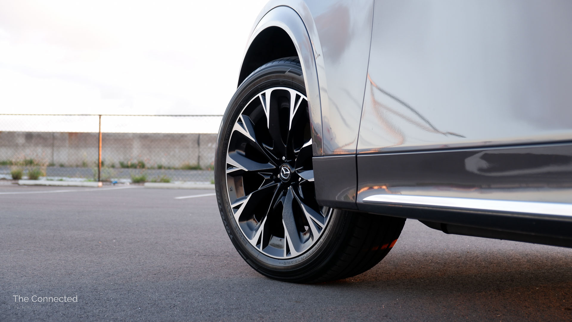 The CX-90 offers an understated exterior with a focus on curves rather than sharp edges, puny-shaped headlights, and premium-looking 21-inch machined alloy wheels on the Azami.