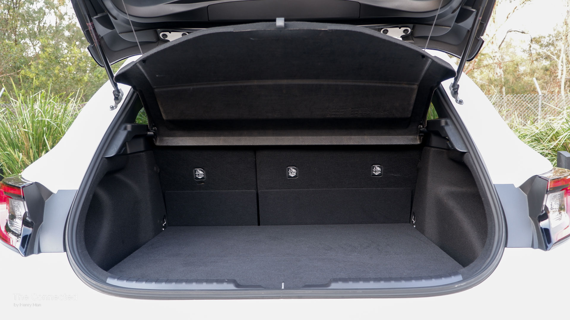 However, it’s offset by cup holders beside each door, a fold-down armrest with another two cup holders, one USB-C charging port under a flap, seatback pockets (despite being sporty bucket seats unlike the i30 N), all-auto up/down windows, and LED lighting for both rows.