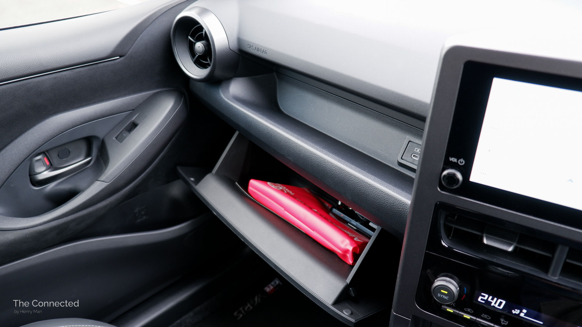 The updated Toyota GR Yaris doesn’t have much space for a phone in the front row with the removal of the middle open shelf. Only a divided small storage slot behind the two cup holders can stand a phone, but you’ll need to stretch the cable across the centre console due to the USB-C port being ahead of the shifter.
