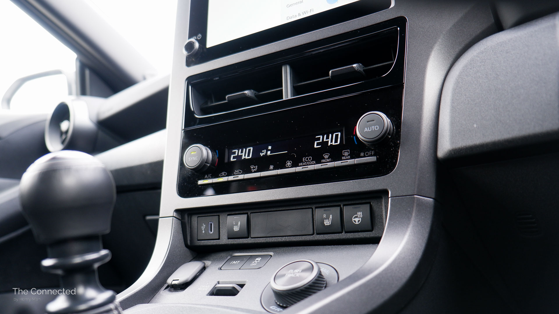 Underneath the screen are a row of physical switches, dials and a dedicated LED display for the single-zone climate control. Just easy.
